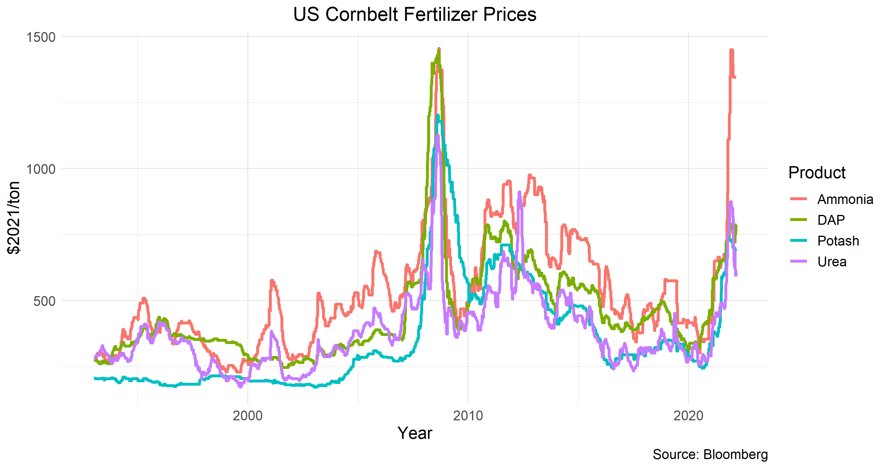 Fertilizer prices approximately doubled between the summer of 2020 and the end of 2021. High fertilizer prices hurt farmers' pocketbooks, especially for fertilizer-intensive crops such as corn. The Russian invasion of Ukraine may further drive up prices, although this has not happened yet as far as I can tell.