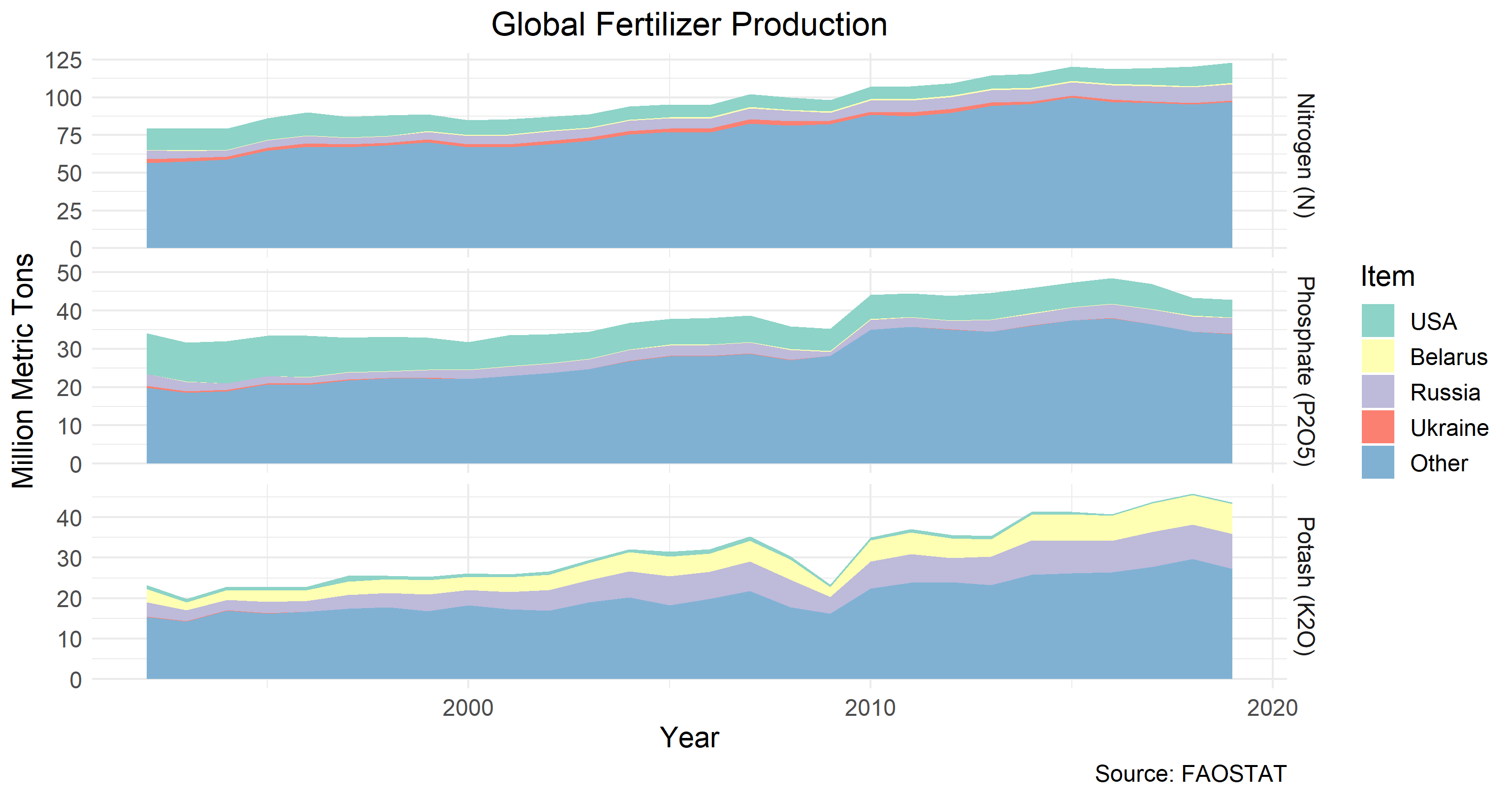 Fertilizers are produced throughout the world and traded heavily between countries. Russia produces 9% of global nitrogen fertilizer, 10% of global phosphate fertilizer, and 20% of global potash fertilizer. It exports more than two thirds of its production of each product. Belarus produces an additional 17% of global potash and exports almost all of it.