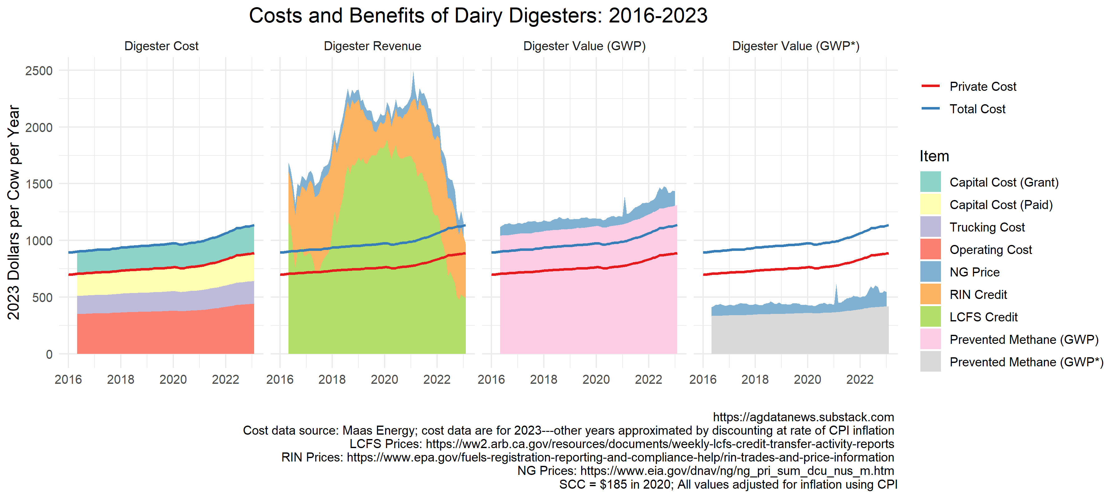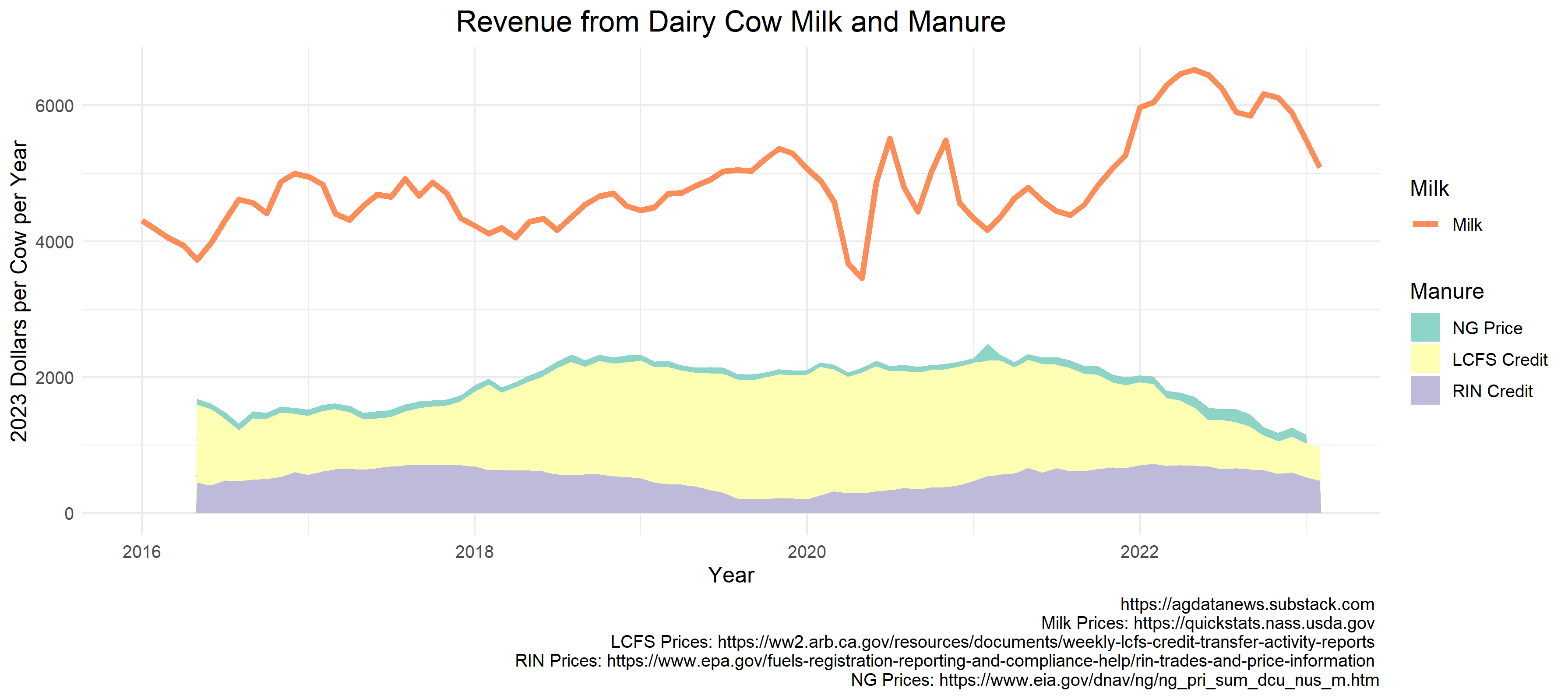 The price of natural gas can fluctuate wildly. I used the US average city gate price because it has better coverage than the CA average city gate price. For the 2023 bar chart, I used $7.11 per thousand cubic feet, which was the US average city gate price in January 2023 and which implies revenue of $128 per milking cow per year. The most recent California city gate price reported by EIA was $7.08 in November last year. Since that time, prices have spiked up and come back down, so the current market value of the gas is likely lower than this.