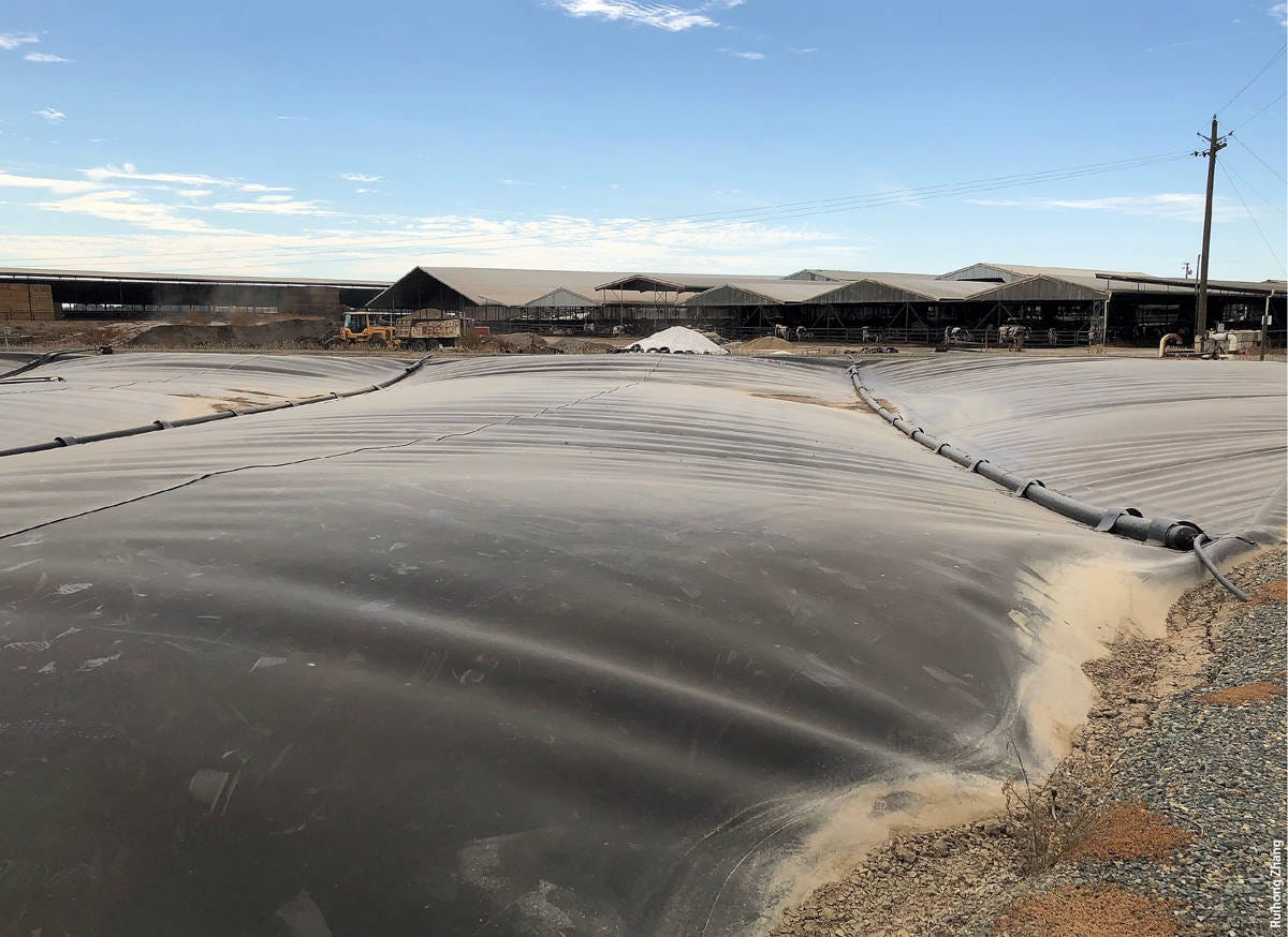 California is targeting a reduction in statewide methane emissions of 40% below 2013 levels by 2030. It is very difficult to reduce cattle burps, so the state has focused on manure emissions, mostly by subsidizing the installation and operation of anaerobic digesters. Dairy farmers wash manure into lagoons, where microbes fed on the contents and emit methane. Anaerobic digesters capture the methane, preventing it from escaping into the atmosphere where it would contribute to global warming. As a bonus, the captured gas can be used in place of natural gas for transportation or electricity generation.