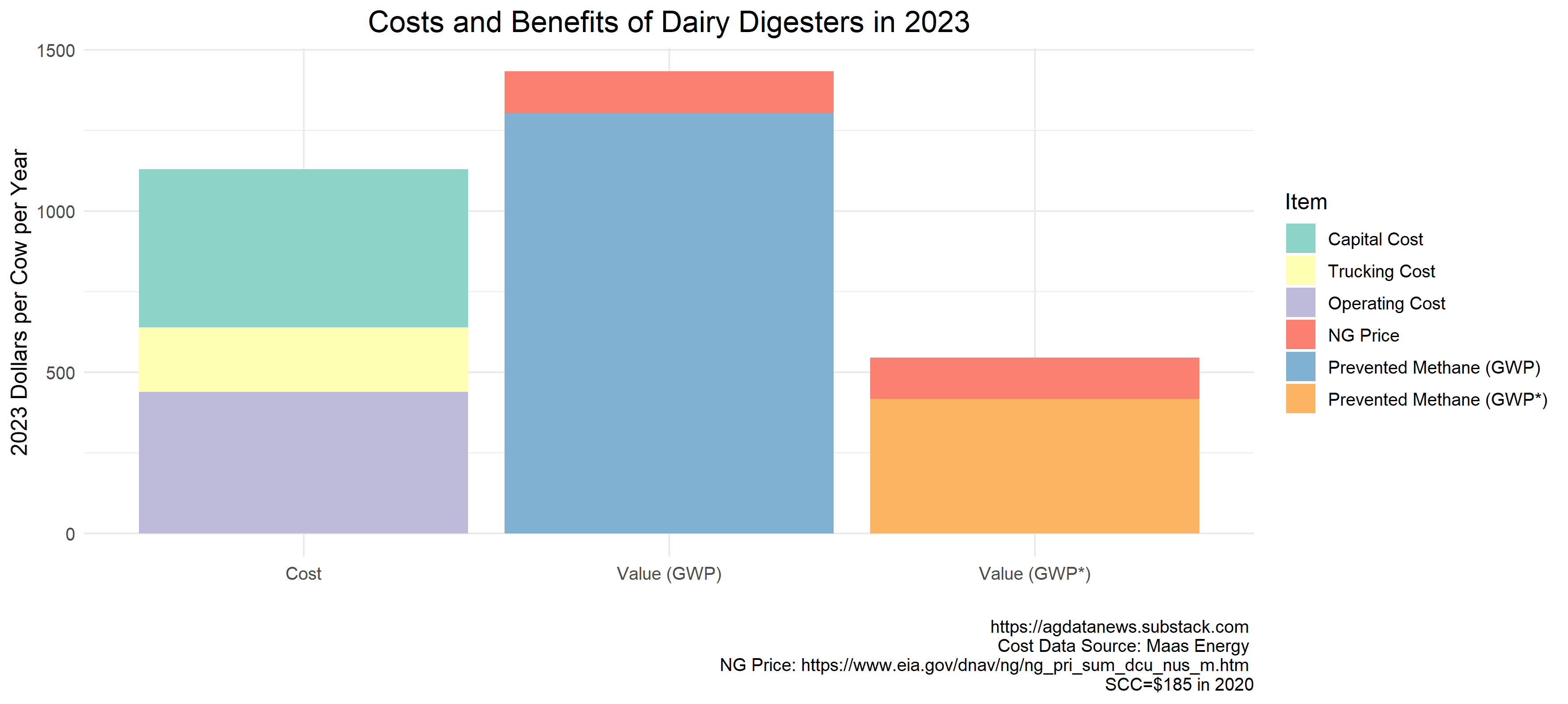 Using an alternative method to account for the short-lived lifespan of methane in the atmosphere, known as GWP*, the value of preventing methane emissions is about $420 per milking cow per year and the benefits of anaerobic digesters are much lower than their costs. I prefer GWP*, but there is a vigorous scientific debate on this topic.