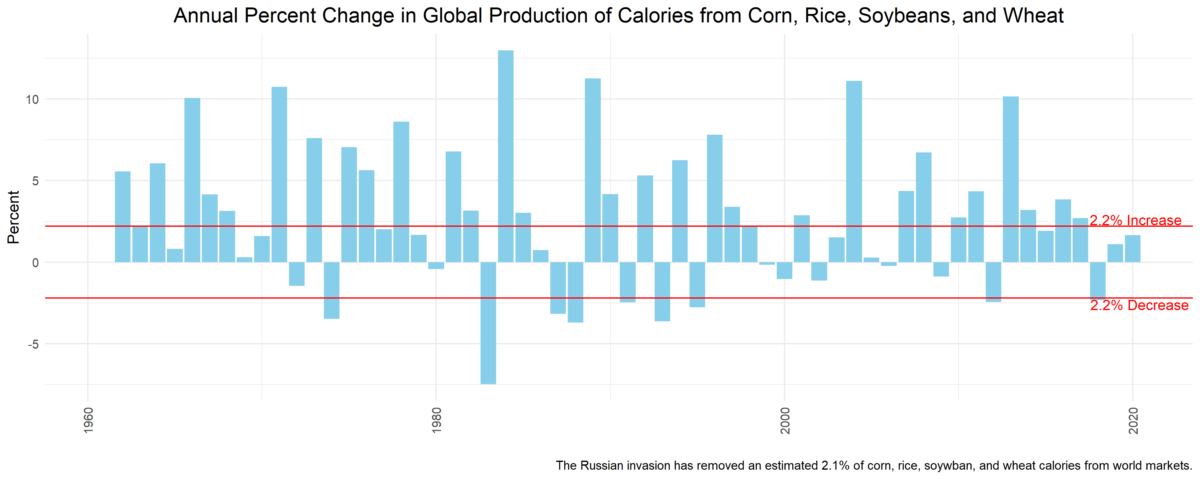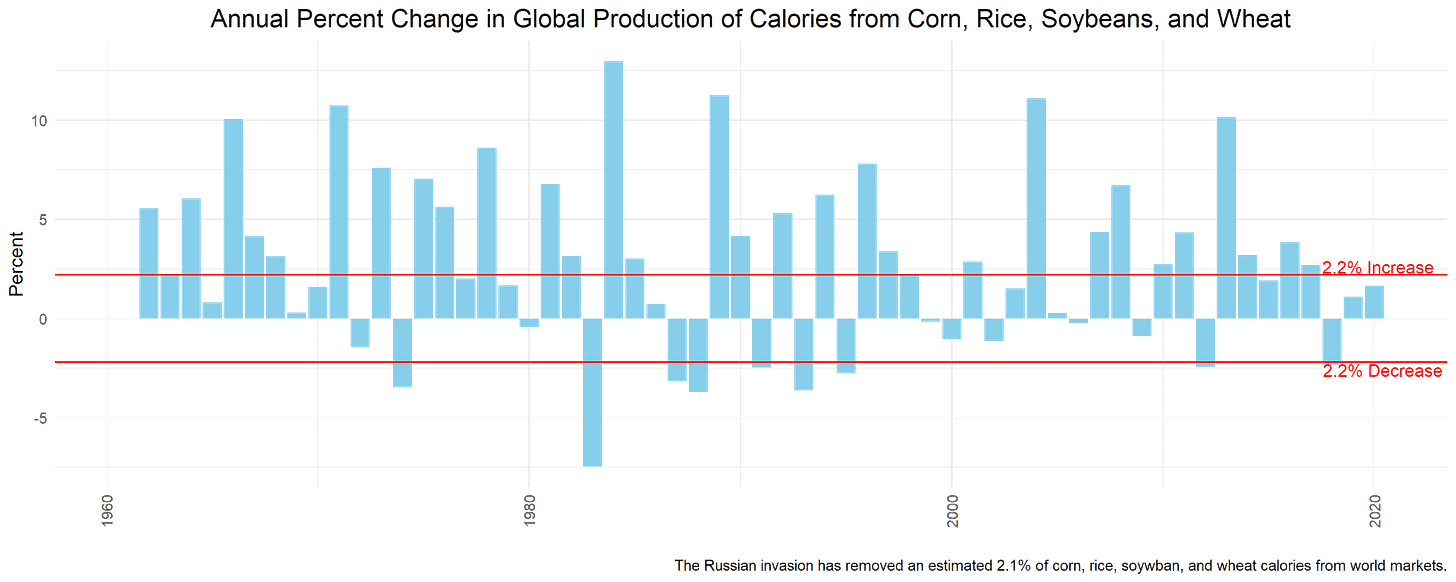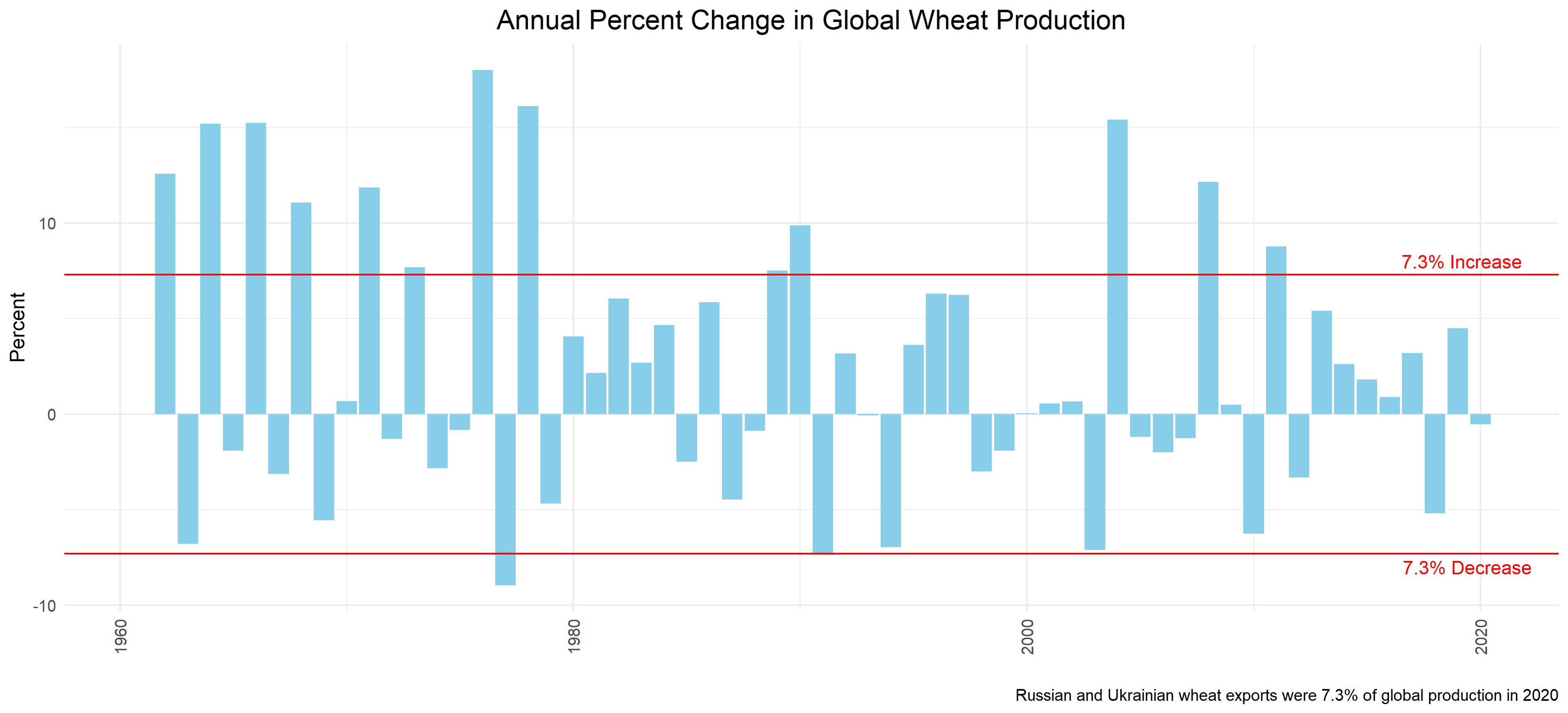 How common are market shocks of this magnitude? Russian and Ukrainian wheat exports were 7.3% of global production in 2020. Wheat production declined 6.3% in 2010, in part due to a drought that reduced Russian production by 20 million metric tons. Similarly large declines also occurred in 1991, 1994, 2003, and 2018.