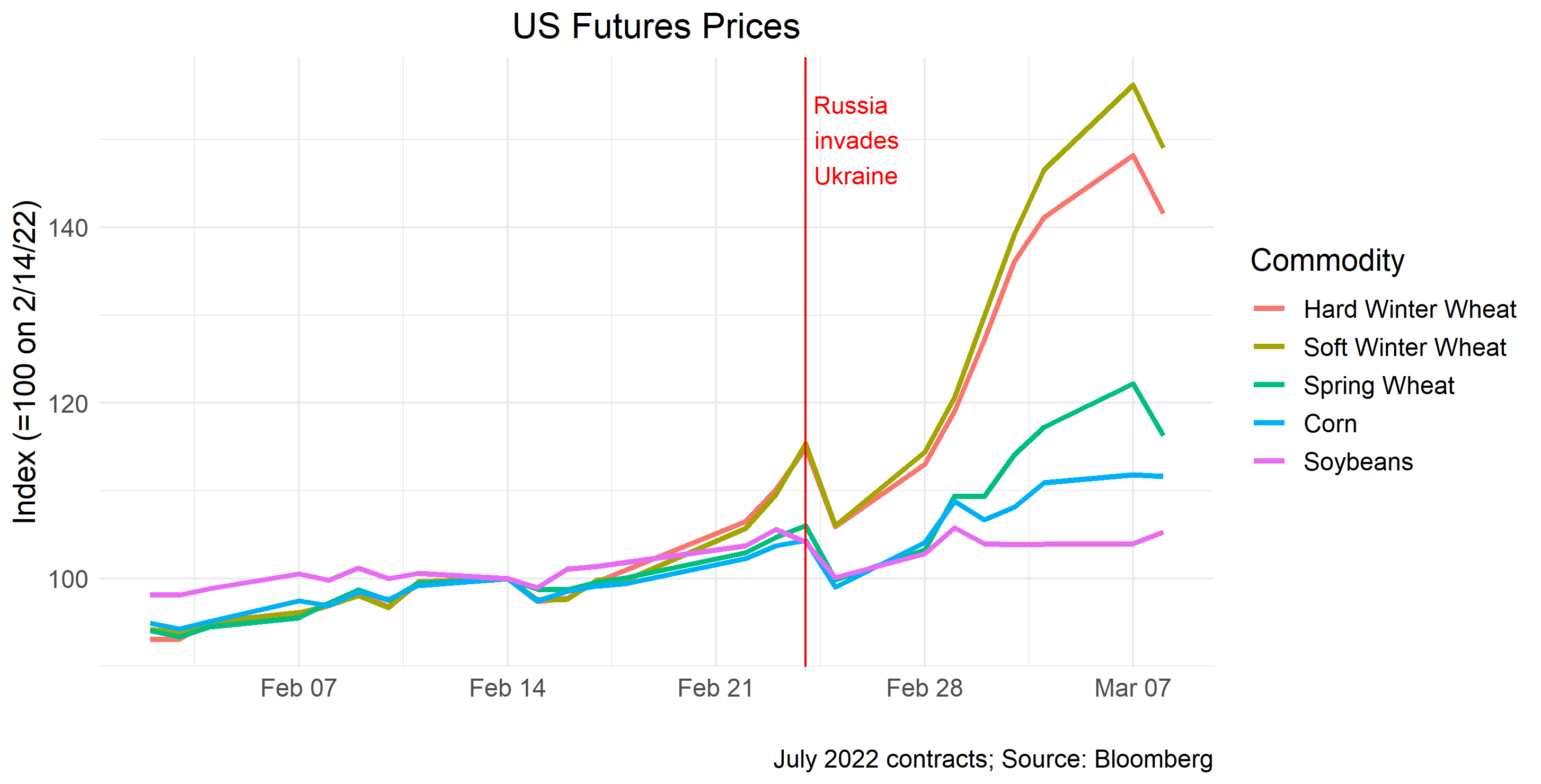 Wheat futures prices have increased since the day before the invasion (February 23), but by different amounts depending on variety. Winter wheat is up about 30%, whereas spring wheat is up 10%. Corn prices have increased by 7% since February 23 and soybean prices are unchanged. Winter wheat prices did drift up in the week before the invasion as Russia built its military presence on the border. Since February 14, winter wheat is up about 45%, spring wheat 16%, corn 12%, and soybeans 5%.