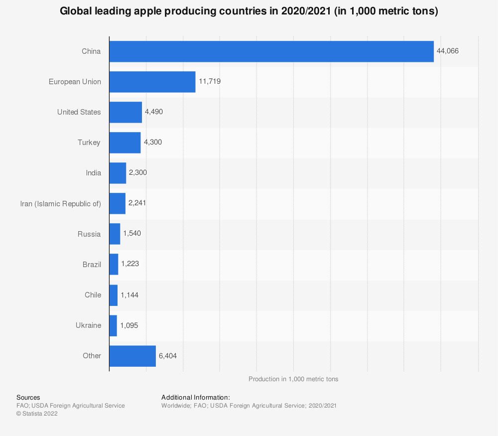 Global production of apples for 2021/22 is around 81.6 million tons, half of which are produced in China. The top five apple-producing countries following China are the USA, Turkey, India, Iran, and Russia. If the EU countries were taken as a whole, its production would come second.
