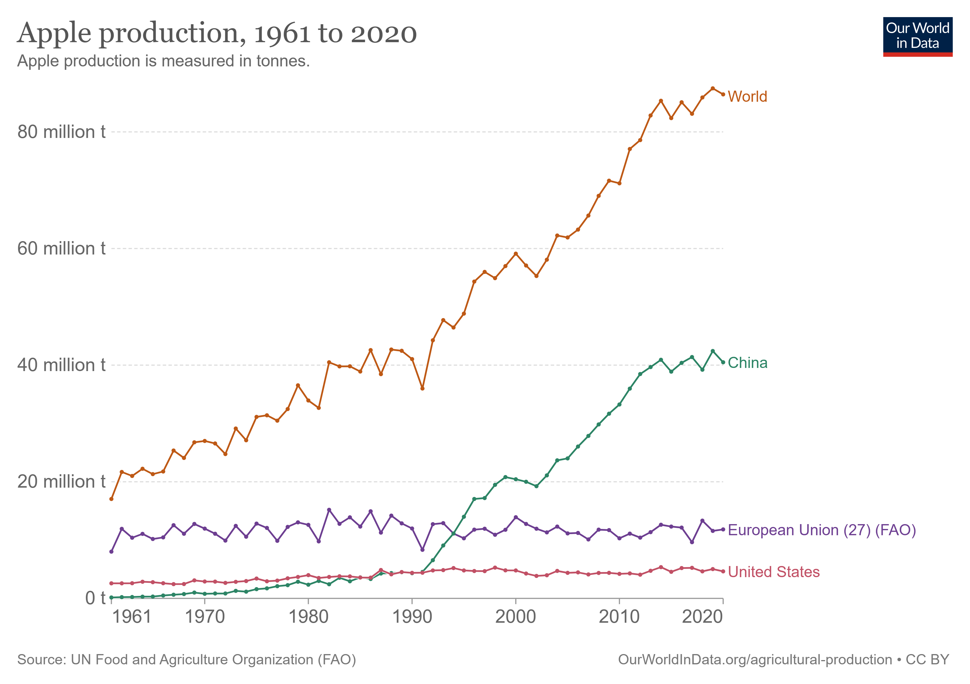 Global apple production has quadrupled in the past 60 years from 20 to over 80 million tons. Much of this explosion is due to the rapid development of the apple industry in China, which has increased production by a factor of 10 since 1990. The magical thing is that the huge production increase in China is almost fully covered by synchronously-growing domestic demand; less than 3% of its production was exported in 2021.