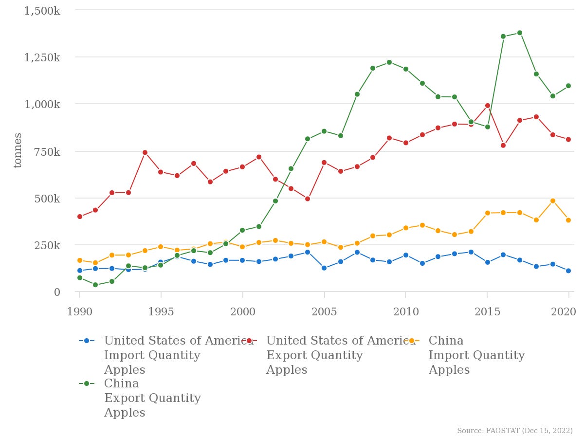 Even though China produces multiple times more apples than the United States, there is little difference in the import and export volume between the two in recent years. In addition to being the largest producer of apples, China is also the world's largest exporter, followed by the United States. Both of them are net exporters, exporting 6 to 7 times as much as imports in the past 20 years.